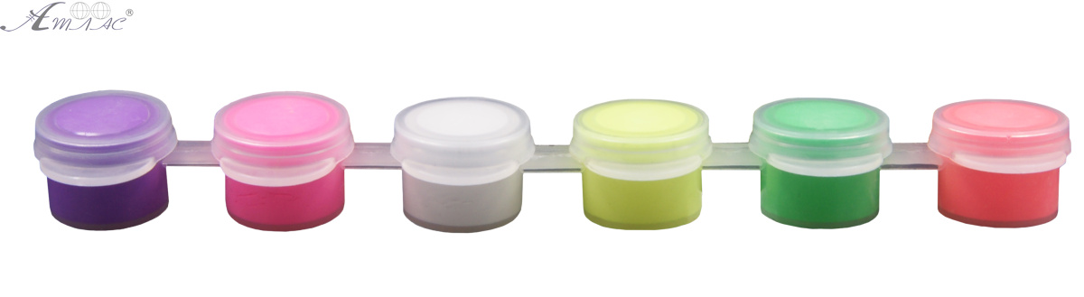 Флуоресцентные акриловые краски могут светиться под действием ультрафиолетового излучения. Эти краски растворяются в воде, быстро высыхают, а также имеют водостойкие свойства после высыхания. Они подходят для рисования на бумаге и холсте, также могут быть использованы для окрашивания стеклянных поверхностей и миниатюр. Химические свойства этих красок позволяют создавать рельефные текстуры. Также акриловые краски отличаются эластичностью, что предотвращает возникновение трещин в готовых изделиях. Сразу после использования акриловых красок, кисти и палитры можно легко отмыть теплой водой с мылом. Эта спайка содержит следующие цвета: фиолетовый, розовый, белый, желтый (лимонный), зеленый, оранжевый. Фактический цвет изделия может отличаться от изображенного на фото.