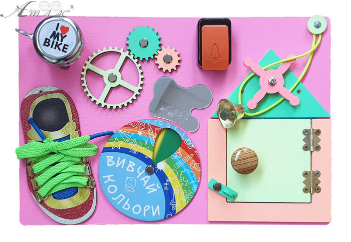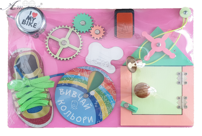 Бизиборд - детская игрушка, развивающая мелкую моторику и внимательность малыша в игровой форме. Изготовлен из окрашенной фанеры с напечатанным текстом. Фактический оттенок товара может отличаться от изображенного на фото.
