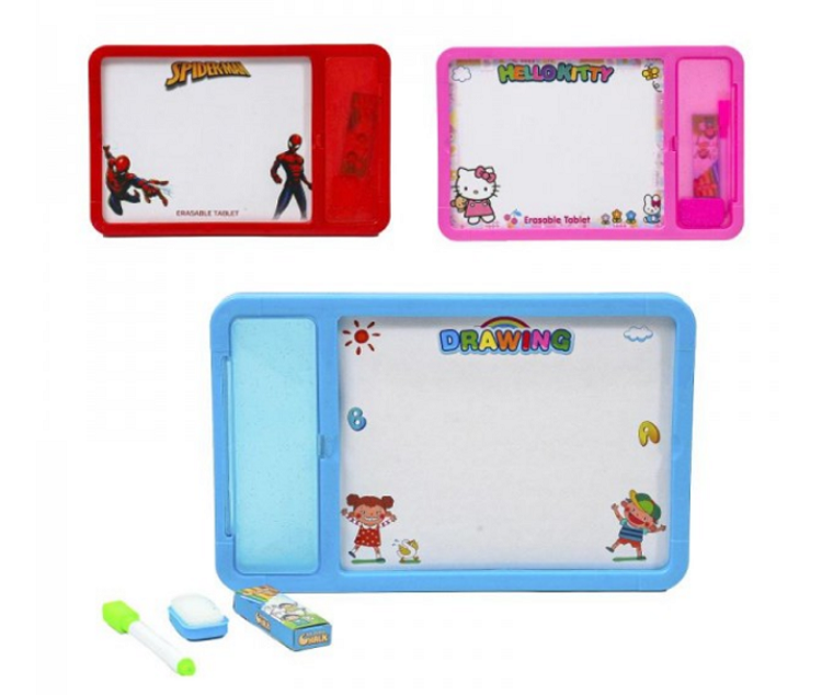Доска двусторонняя, с покрытием для рисования маркерами, и с покрытием для рисования мелками. Также в комплекте есть мел, маркер и губка. Размер : 27,5 х 17 см. Фактический цвет товара может отличаться от изображенного на фото.
