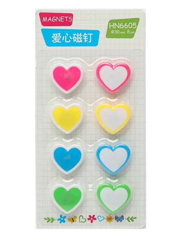 Набор из шести цветных магнитов сердца для презентационного оборудывания. Диаметр магнита 30 мм, упакованы в блистер. Фактический цвет может отличаться от изображенного на фото.