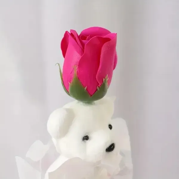 Милая композиция из игрушечного мишки с розой создаст море положительных эмоций у женщины любого возраста. Цветок розы при этом еще и является декоративным мылом! Высота: 38 см. Фактический оттенок изделия может отличаться от представленного на фотографии из-за особенностей цветопередачи экрана.