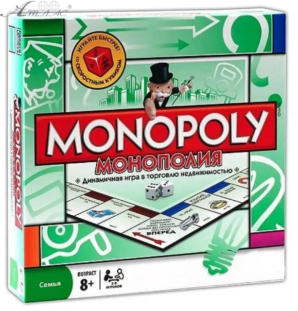 « Монополия » — это классическая игра, в которой вы можете покупать, арендовать и продавать свою собственность! Любителям простоты механики, захватывающего игрового процесса, и почитателям истоков посвящается - настольная игра Монополия. Рус. язык. В комплект входят: игровое поле, 8 жетонов (фишки игроков), 28 карточек на право собственности, 16 карточек ШАНС, 16 карточек Общественная Казна, 1 комплект денег МОНОПОЛИИ, 32 зеленых дома, 12 красных отелей, 2 кубика, 1 Скоростной Кубик, Инструкция. Для детей старше восьми лет. В коробке 27-27-5 см. Фактический оттенок товара может отличаться от изображенного на фото.