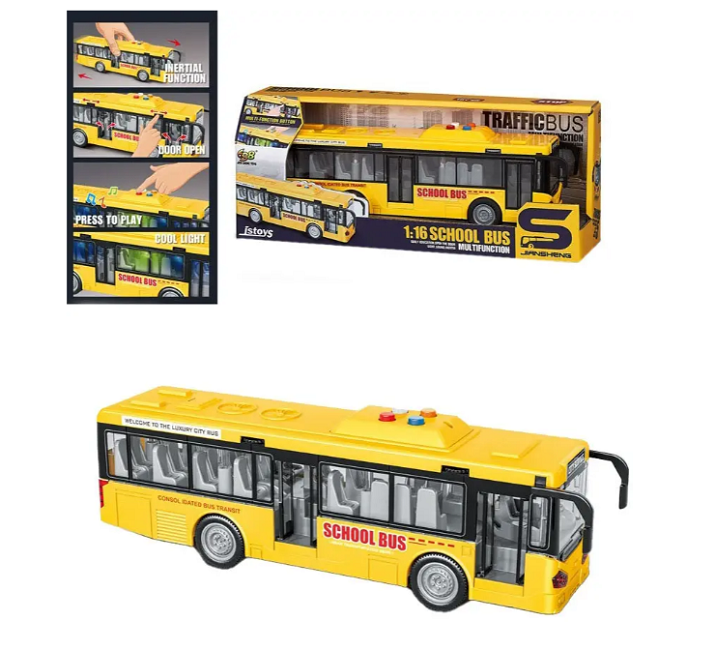 Одноэтажный школьный автобус желтого цвета. Автобус со световыми и звуковыми эффектами, двери открываются и закрываются колесиком возле двери. С инерционным механизмом. Размер 28 см. Возраст 3+. Фактический оттенок изделия может отличаться от представленного на фотографии из-за особенностей цветопередачи экрана.