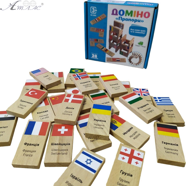 Набор домино из дерева 28шт с изображением флагов разных стран. Размер доминошки 6 х 3 х 0,8 см. Подойдет для изучения флагов стран и развития мелкой моторики у детей. Фактический оттенок товара может отличаться от изображенного на фото.