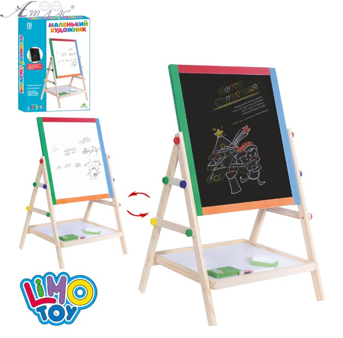 Игрушка Деревянная Доска двухсторонняя, магнитная мольберт Маленький художник. С одной стороны доска черная под мел с другой белая для маркера и магнитная. В комплекте доска, мел, маркер и губка. Размеры доски: 35,5×40 см. Общий размер в рабочем состоянии: 39×35×67 см. Размер коробки 35 х 50 х 4,5 см. Фактический оттенок товара может отличаться от изображенного на фото.