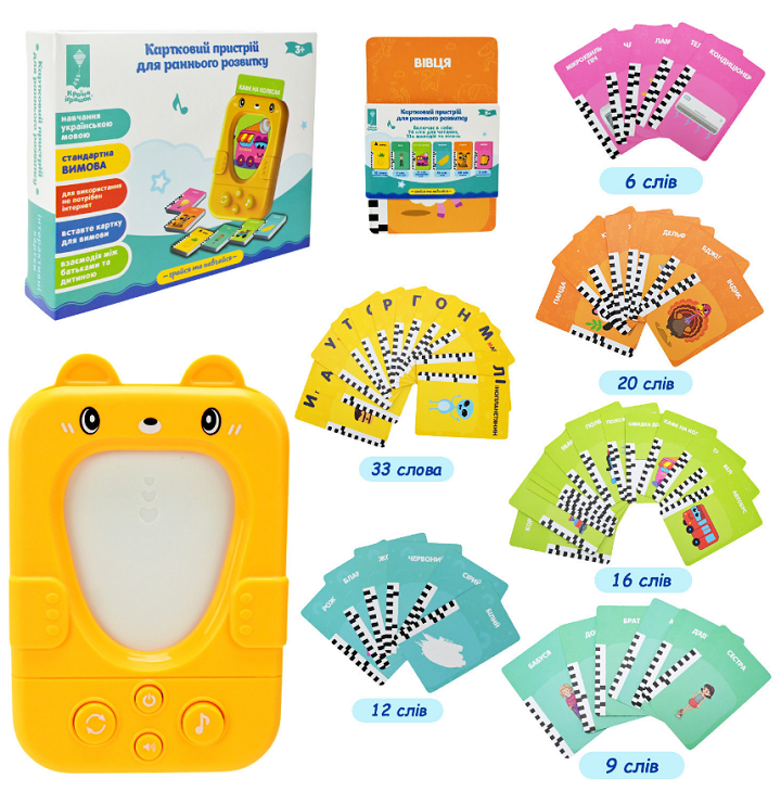 Игрушка Карточное устройство для раннего развития. Особенности игрушки: - включает в себя 48 двусторонних карточек, с 96 словами на разные темы; - слова озвучены на украинском языке; - для использования не требуется интернет; - есть возможность регулировки громкости; - воспроизводит 10+ веселых и танцевальных мелодий и песен; - игрушка выполнена из качественного и прочного ABS пластика, без острых углов, безопасного для детей; - игрушка адаптирована для маленьких ручек, что облегчает ее использование малышами. С такой игрушкой дети будут развивать пространственное мышление, фантазию и воображение, мелкую моторику, сенсорные ощущения, а также способствовать радостному и творческому времяпровождению вашего ребенка. Игрушка работает от батареек 3 шт. типа ААА (не входят в комплект). Размер упаковки: 15,5 х 3,2 х 12,3 см. Фактический оттенок изделия может отличаться от представленного на фотографии из-за особенностей цветопередачи экрана.