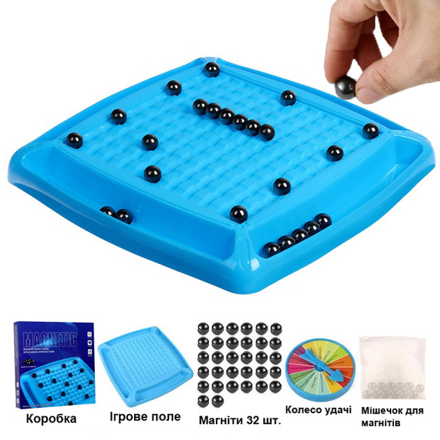 Настольная игра Магнитные шашки 32 шарика, Магнитный бой Magnetic Battle chess. Игровое поле 28 х 28см. Правила игры: Вариант 1. Поместите игровое поле на столе и распределите магнитные шарики поровну между игроками. Каждый игрок по очереди помещает шарик в любое отверстие на доске. Если магниты притянулись друг с другом, вы забираете притянувшиеся шарики себе. Когда вы будете делать ход (класть магниты), старайтесь не позволять магниту притягиваться. Выигрывает тот игрок, у которого не останется ни одного магнита. Вариант 2. Поместите игровое поле на столе и распределите магнитные шарики поровну между игроками. Каждый игрок по очереди помещает шарик в любое отверстие на доске. Выигрывает тот игрок, у которого не останется ни одного магнита. Проигравший крутит стрелку на колесе фортуны и выполняет задание. Вариант 3. Раскидывайте шарики с детьми, получая интересные фигуры или изучайте силу притяжения с детьми. Фактический оттенок изделия может отличаться от представленного на фотографии из-за особенностей цветопередачи экрана.