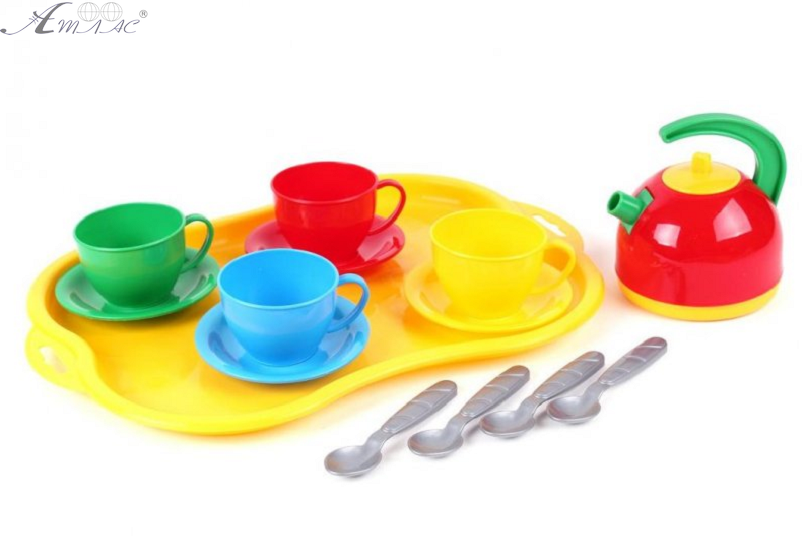 Набор посуды Маринка 6 для маленькой хозяйки. В набор входят 14 предметов: чайник, чашки, тарелки, ложки, поднос. Материал: крепкий пластик. Размер подноса: 32×23×1,5 см. Фактический оттенок товара может отличаться от изображенного на фото.