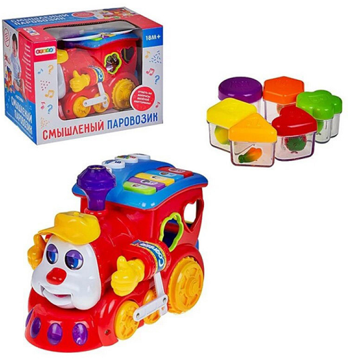 Игрушка Сортер Смышленый Паровозик RT8802. У паровозика моргающие глазки и подвижный ротик, очень красивая подсветка, подвижные колеса, пианино, кнопки переключения режимов, кнопка "Гудок"-активирующая режим движения. Дополнительно паровозик можно использовать как сортер, сопоставляя вложенные в багажник фигуры с формой отверстий, (шестиугольник, круг, квадрат, треугольник, сердечко, цветочек), кроме того, в этих фигурках можно найти фрукты и ягоды: желтый лимон, красная клубника, зеленое яблоко, желтый банан, фиолетовый виноград, оранжевый апельсин. Покупая игрушку вы приобретаете целый комбайн различных развивалок и он будет долгое время интересен вашему малышу. Упаковка и озвучка на рус. языке. Размер упаковки : 24 х 16 х 18 см Фактический оттенок изделия может отличаться от представленного на фотографии из-за особенностей цветопередачи экрана.