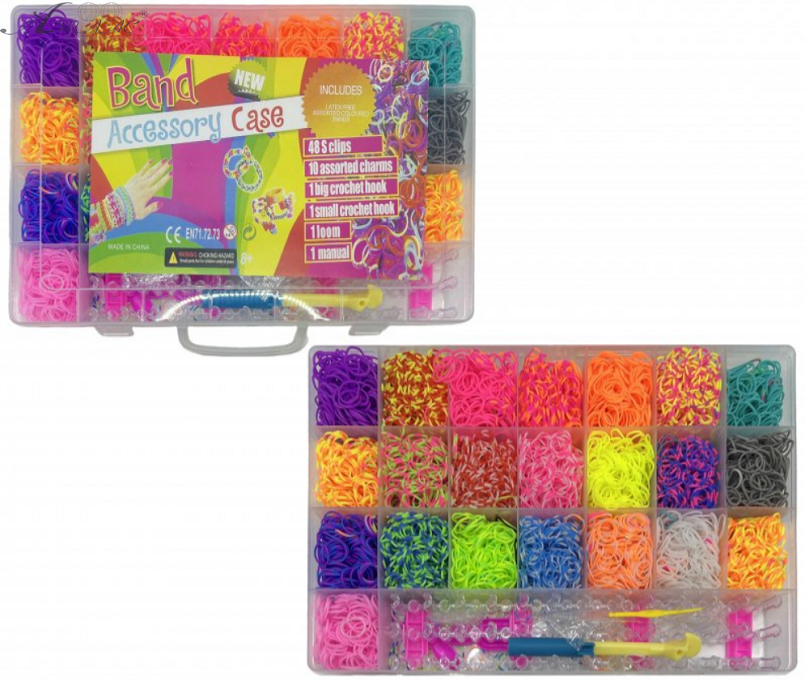 В комплект входит 5500 качественных резинок 22 ярких цветов, а также удобный станок, мини-рогатка и крючок. Все это в удобном пластиковом, прозрачном чемоданчике ! Размер : 34 х 21 х 4 см Фактический оттенок изделия может отличаться от представленного на фотографии из-за особенностей цветопередачи экрана.