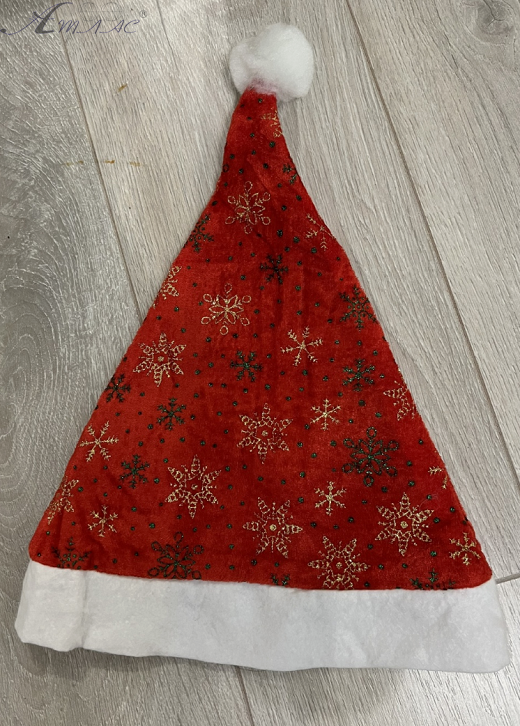 Шапка Санта-Клауса Красная со снежинками и белой окантовкой. Материал изделия мягкий и приятный на ощупь. Объем 58см. Высота 41см. Фактический оттенок товара может отличаться от изображенного на фото.