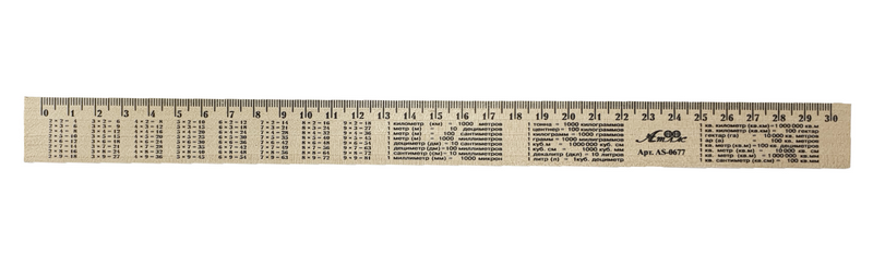 Линейка Атлас 30 см деревянная напечатанная со штрихкодом. Данная линейка изготовлена из дерева с напечатанной шкалой длиной 30 см и плюс на ней есть таблица умножения. Размеры изделия 31 х 2,5 х 0,25 см. Фактический оттенок товара может отличаться от изображенного на фото.