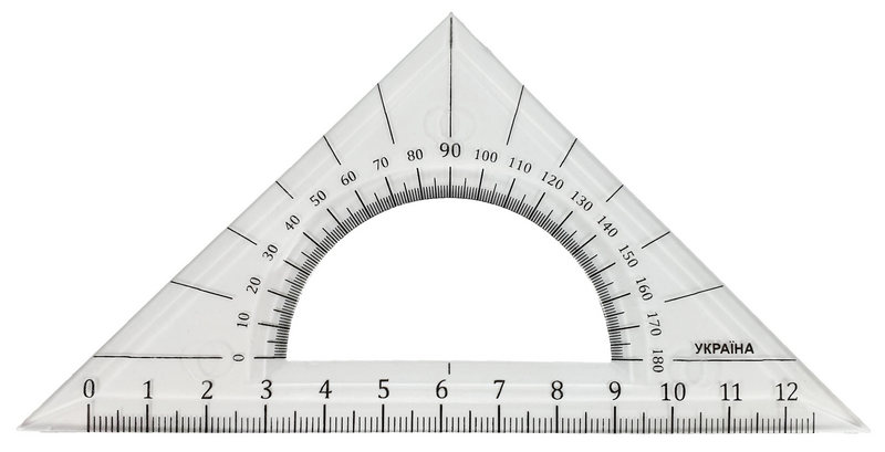 Данный треугольник изготовлен из прозрачного пластика со шкалой длиной 125 мм, с углами 90-45-45 градусов. Также он оснащен транспортиром. Размеры изделия 14 х 7 х 0,1 см.
