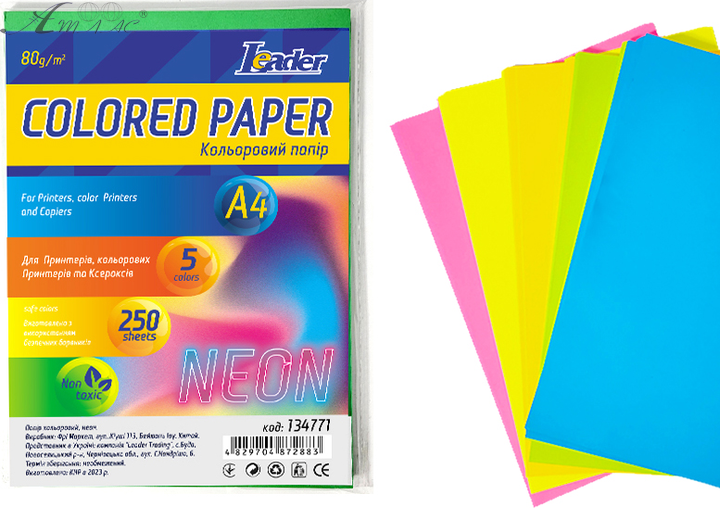 Бумага цветная A4 80 г микс 100 листов, 5 цветов Leader  134781