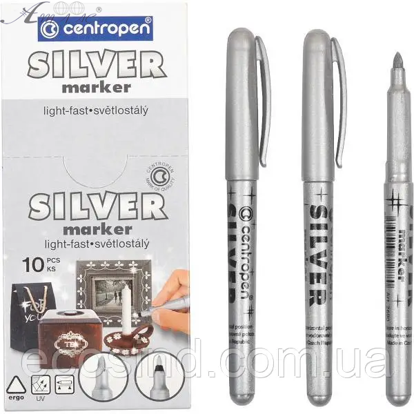 Маркер декоративный, Сentropen silver.Надписи устойчивы к атмосферным воздействиям, не боятся влаги, стойки к истиранию. Поверхности на которых применяется: металл, стекло, пластик, керамика, дерево. Основа чернил: масляная. Ширина стержня: 1 мм.