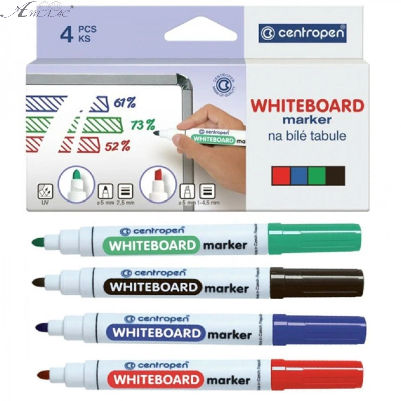 Набор маркеров Centropen для надписей на сухостираемых досках и гладких поверхностях. След чернил легко удаляется сухой тканью. Большой объем чернил! Хранить в горизонтальном положении. Не высыхает без колпачка в течение 5 дней. Круглый пишущий узел. Ширина следа 2,5 мм. Фактический оттенок может отличаться от изображенного на фото.