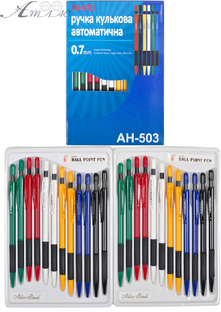 Ручка шариковая Aihao автоматическая в коробке 24 шт АН-503М. Толщина письма 0,7мм. Фактический цвет товара может отличаться от изображенного на фото.