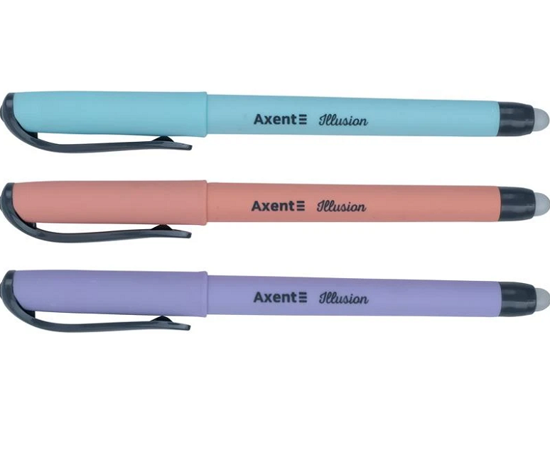 Ручка Axent Illusion пиши-стирай имеет полезную особенность - в течение 12 часов есть возможность удаления записи с помощью резинки, встроенной в корпус. Чернила стираются не за счет механического стирания и отслаивания частиц резинки, а за счет свойств самых чернил - чернила нагреваются во время трения и исчезают при нагревании. Фактический вид товара может отличаться от изображенного на фото.