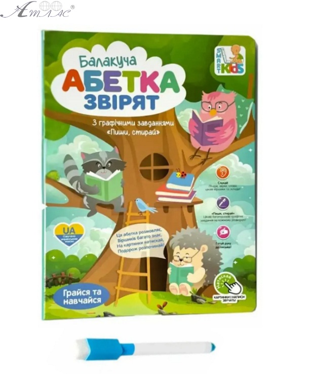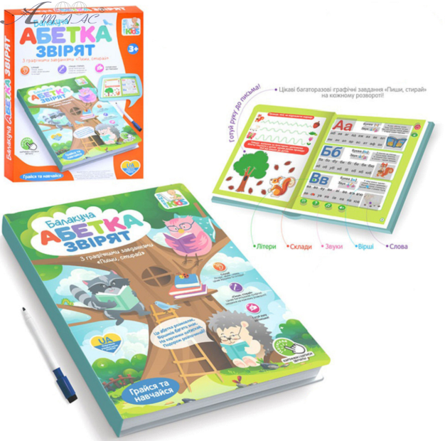 Електронна інтерактивна книга «Абетка звірят» відмінно підійде для дітей віком від 3 до 6 років. Дуже багато функцій – читає, дає завдання, у книзі можна багато разів писати та стерти написане тощо. Вона допоможе розвивати мовні та музичні навички, а також зацікавить малюка у вивченні літер та назв звірят. Працює від трьох батарей типу ААА. Розмір упаковки: 28 х 21 х 2,5 см. Фактичний відтінок виробу може відрізнятися від представленого на фотографії через особливості кольоропередачі екрану.