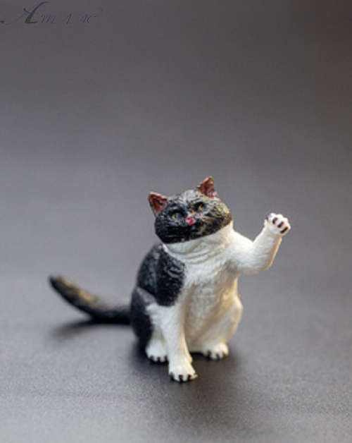 Серія іграшок домашні коти. Іграшка являє собою фігурку сидячого кота з піднятою вгору лапкою. Забарвлення чорно-біле. Деталізована текстура шерсті. Іграшка виготовлена з пластику. Розмір: 5 см. Фактичний відтінок виробу може відрізнятися від представленого на фотографії через особливості кольоропередачі екрану.