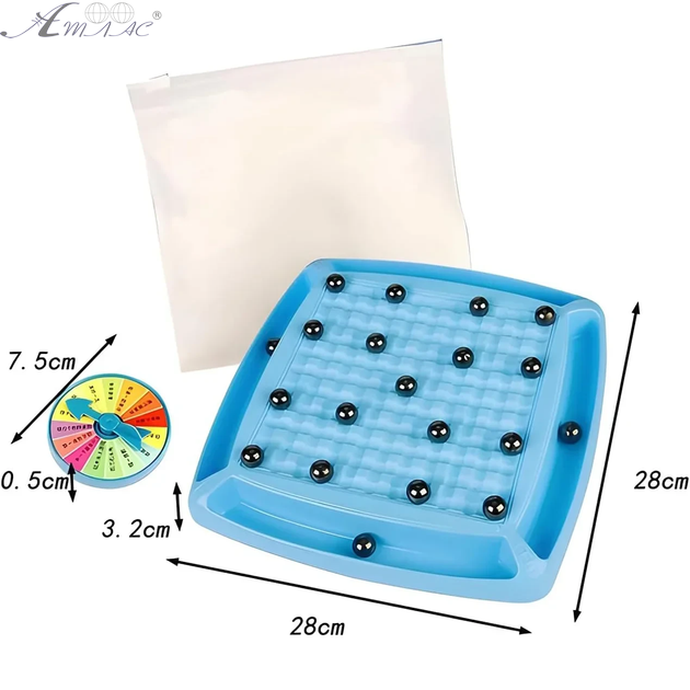 Настільна гра Магнітні шашки 32 кульки, Магнітний бій Magnetic Battle chess. Ігрове поле 28 х 28см. Правила гри: Варіант 1. Помістіть ігрове поле на столі та розподіліть магнітні кульки порівну між гравцями. Кожен гравець по черзі поміщає кульку у будь-який отвір на дошці. Якщо магніти притягнулися один з одним, ви забираєте кульки, що притягнулися, собі. Коли ви робитимете хід (класть магніти), намагайтеся не дозволяти магніту притягуватися. Виграє гравець, у якого не залишиться жодного магніту. Варіант 2. Помістіть ігрове поле на столі та розподіліть магнітні кульки порівну між гравцями. Кожен гравець по черзі поміщає кульку у будь-який отвір на дошці. Виграє гравець, у якого не залишиться жодного магніту. Той, хто програв, крутить стрілку на колесі фортуни і виконує завдання. Варіант 3. Розкидайте кульки з дітьми, отримуючи цікаві постаті або вивчайте силу тяжіння з дітьми. Фактичний відтінок виробу може відрізнятися від представленого на фотографії через особливості кольоропередачі екрану.