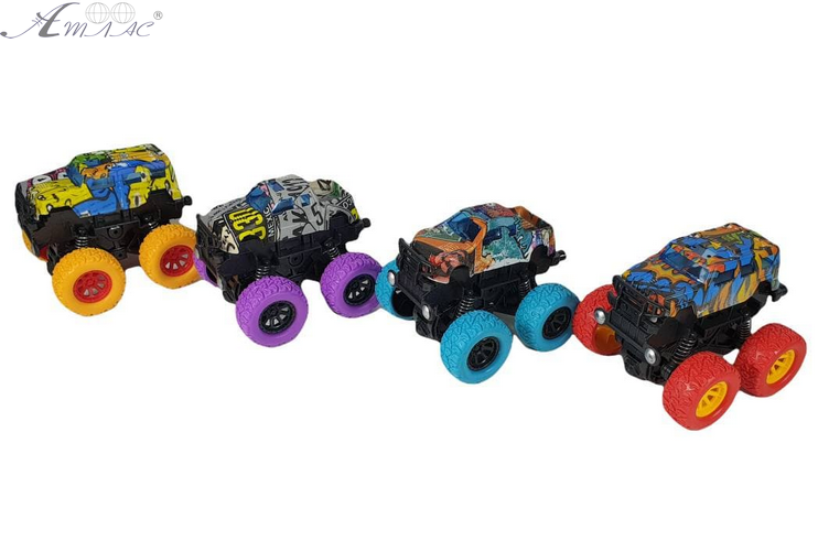 Інерційні іграшкові машинки з яскравим дизайном у стилі графіті. Інерційний автомобіль (монстр трак) з пружинною підвіскою. Кузов машинки похитується під час руху, а великі гумові колеса забезпечують хорошу прохідність. Розмір машинки: 9 х 9 х 7 см. Фактичний відтінок виробу може відрізнятися від представленого на фотографії через особливості кольоропередачі екрану.