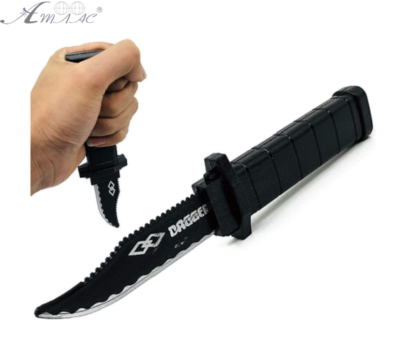 Ніж іграшковий з лейзвієм, що засувається всередину корпусу. Довжина в розкладеному стані – 20,5 см у засунутому – 11 см. Виготовлений із пластику. Можна використовувати для ігор та тренувань. Фактичний відтінок товару може відрізнятись від зображеного на фото.