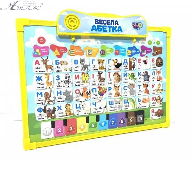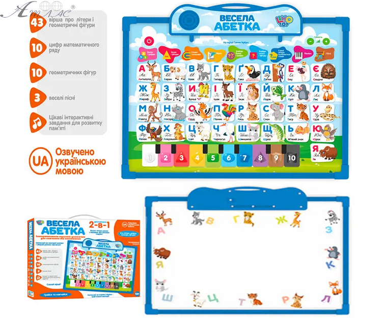 Інтерактивна двостороння дошка Веселий алфавіт 2 в 1, арт. SK 0020 Прогрес не стоїть на місці і поряд із звичайними іграшками з'явилися іграшки нового покоління – інтерактивні. Вони взаємодіють з дитиною та обмін інформацією в такому режимі сприяє активізації уваги, а також тому, що дитина з інтересом засвоює нову інформацію. Функції: - 43 вірші про літери та геометричні фігури - 10 цифр - 10 геометричних фігур - 3 веселі пісні - Цікаві інтерактивні завдання для розвитку пам'яті - веселе піаніно Зі зворотного боку дитина виявить мольберт, на якому можна малювати фломастерами! Розмір дошки: 35 х 25 х 2 см. Фактичний відтінок виробу може відрізнятися від представленого на фотографії через особливості кольоропередачі екрану.