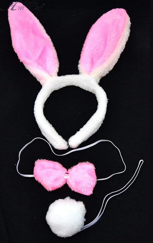 Набір обруч Вушка зайчика з хвостиком і метеликом на шию, хутряні. Колір - білий з рожевим. Аксесуари для костюмів. Розмір обруча приблизно 28 х 13 см. Фактичний відтінок виробу може відрізнятися від представленого на фотографії через особливості передачі кольоропередачі екрану.