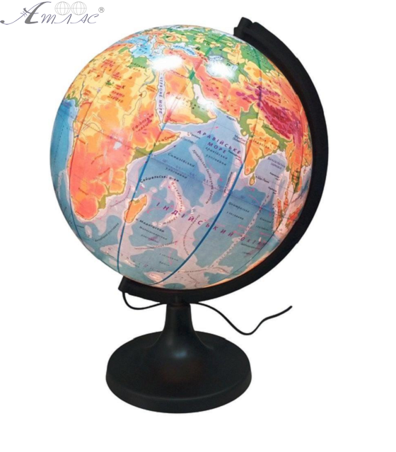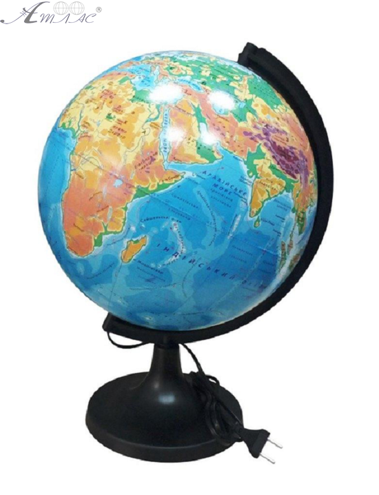 Глобус навчальний фізичний українською мовою з підсвічуванням. Діаметр 32см. Зроблений із пластику. Глобус, на відміну від географічних карт, зручний для отримання загального уявлення про розташування та розмір континентів та океанів. Фактичний відтінок виробу може відрізнятися від представленого на фотографії через особливості кольору екрану.