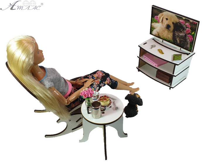 Тумба з телевізором виготовлена із МДФ (екологічно чистого матеріалу, що складається із спресованої під температурою деревної стружки без хімічних домішок). Розмір тумби 10 х 6,5 х 6,7 см телевізор – 10,5 х 7,5 х 2 см. Іграшкові меблі призначені для ляльок типу "Барбі" зростом приблизно 30 см. Вони пропонуються в широкій різноманітності варіантів, якими можна обставити кухню, вітальню або спальню лялькового будиночка. Фактичний відтінок виробу може відрізнятись від зображеного на фото.