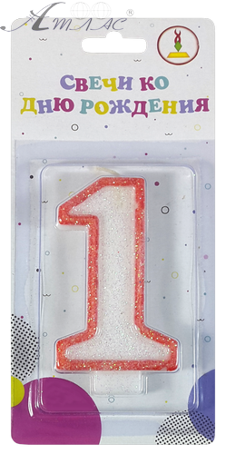 Свіча цифра "1" біла з блискітками та помаранчевим кантом, 7 см вистотою та 1 см шириною, вставляється у торт. Висота ніжки 6 мм. Запакована у блістер. Час горіння 5-10 хвилин. Виготовлена з харчового парафіну та не містить шкідливих для здоров'я домішок. Фактичний вигляд товару може відрізнятися від зображеного на фото.