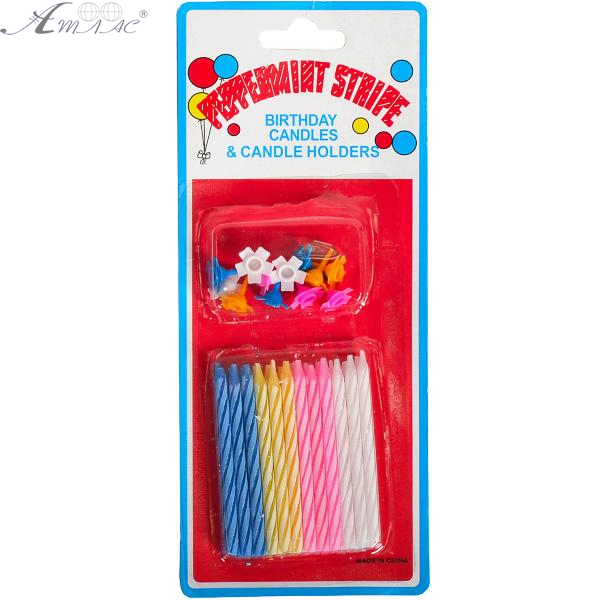 Свічки набір, 24 шт. свічок 5,5см довжиною + 12 шт. тримачів, у блістері 13307. Такі свічки яскраві та безпечні, застосовуються для тортів та пирогів. Фактичний колір товару може відрізнятись від зображеного на фото.