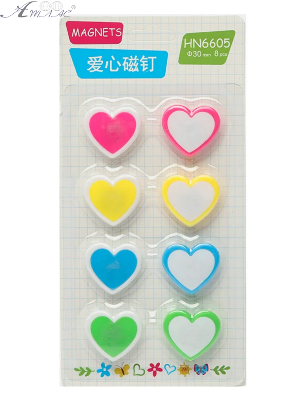 Набор из шести цветных магнитов сердца для презентационного оборудывания. Диаметр магнита 30 мм, упакованы в блистер. Фактический цвет может отличаться от изображенного на фото.