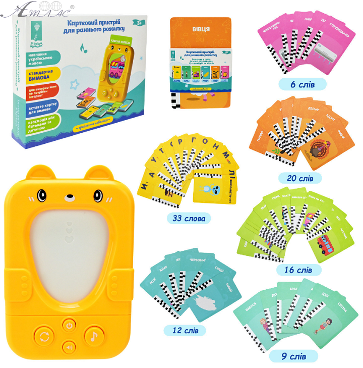 Игрушка Карточное устройство для раннего развития. Особенности игрушки: - включает в себя 48 двусторонних карточек, с 96 словами на разные темы; - слова озвучены на украинском языке; - для использования не требуется интернет; - есть возможность регулировки громкости; - воспроизводит 10+ веселых и танцевальных мелодий и песен; - игрушка выполнена из качественного и прочного ABS пластика, без острых углов, безопасного для детей; - игрушка адаптирована для маленьких ручек, что облегчает ее использование малышами. С такой игрушкой дети будут развивать пространственное мышление, фантазию и воображение, мелкую моторику, сенсорные ощущения, а также способствовать радостному и творческому времяпровождению вашего ребенка. Игрушка работает от батареек 3 шт. типа ААА (не входят в комплект). Размер упаковки: 15,5 х 3,2 х 12,3 см. Фактический оттенок изделия может отличаться от представленного на фотографии из-за особенностей цветопередачи экрана.