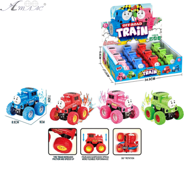 Паровозик инерционный на больших колесах с амортизацией, в наличии 4 цета. Размер : 9 х 8,5 х 8 см Фактический оттенок изделия может отличаться от изображенного на фото.