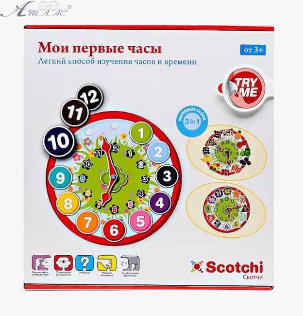 Развивающая игра "Мои первые часы". На русском языке. Изучаем цифры, цвета, формы, время, овощи, фрукты, считаем и сортируем. Карточки прочные, но не жёсткие. На часах напротив цифр расположены липучки, на которые в дальнейшем приклеиваются различные обучающие карточки, у каждой из которых на внутренней стороне, тоже есть липучка Цвета яркие и насыщенные. Возраст от 3 лет. В комплекте: Часы, разделенные на 4 части, цифры разного цвета - 12 шт; цифры разной формы - 12 шт; фрукты и овощи - 12 шт. Фактический оттенок изделия может отличаться от представленного на фотографии из-за особенностей цветопередачи экрана.
