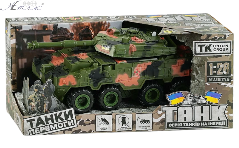 Игрушечный колесный, инерционный танк с различными звуковыми и световыми эффектами. Размер игрушки примерно 25 х 9 х 10см. Масштаб модели 1:28. Фактический оттенок товара может отличаться от изображенного на фото.
