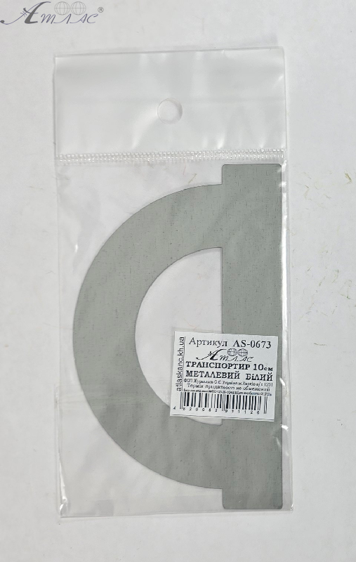 Транспортир Атлас изготовлен из крашеного оцинкованного металла толщиной 0,4мм и напечатан стойкой к истиранию краской. Каждое изделие в пакете со штрих-кодом и потом 100шт в картонной коробке. Размеры изделия 10,3 х 6,4 х 0,04 см. Фактический оттенок изделия может отличаться от изображенного на фото.