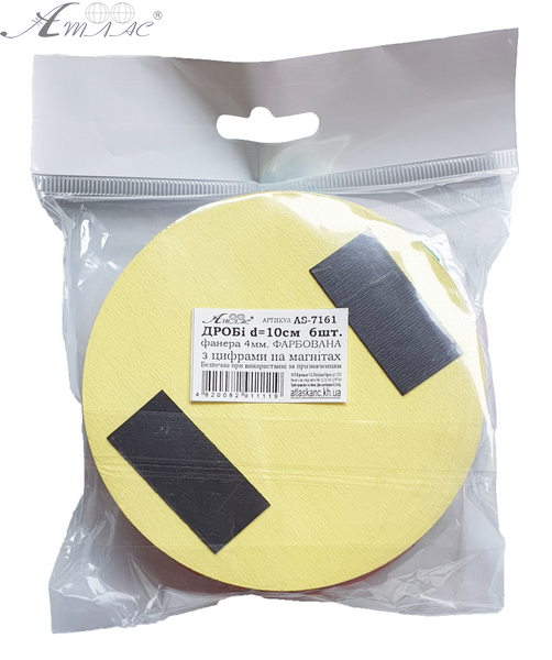 Этот набор дробей содержит фигуры от 1 до 6 частей, диаметром 10 см, изготовленные из окрашенной фанеры с нанесенными на дроби цифрами и приклеенніми магнитами для магнитной доски. Размеры упаковки 10 х 10 х 2,5 см. Наборы учебных дробей состоят из геометрических фигур, разделяющие круг на указанные части. Такие наборы способствуют усвоению материала в наглядной форме, широко применяются в Новой Украинской Школе. Фактический оттенок изделия может отличаться от изображенного на фото.