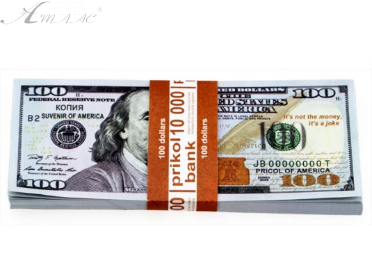 Пачка игрушечных, бумажных денег номиналом в 100 долларов. С двух сторон как оригинал. Размер купюры - 156 х 65 мм. Используется для игры и обучения. В пачке примерно 80 купюр. Фактический вид изделия может отличаться от изображенного на фото.