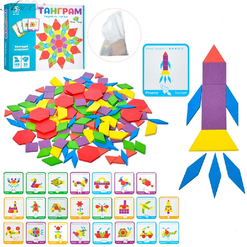 Танграм із картками завданнями MD2239. Навчальні та розвиваючі іграшки дуже важливі для дитини. В упаковці 155 елементів. Розмір упаковки 25 х 21,5 х 4 см. Всі ігрові елементи виконані з екологічно чистої деревини, яка забарвлена високоякісними фарбами та є абсолютно безпечною. Фактичний відтінок товару може відрізнятись від зображеного на фото.