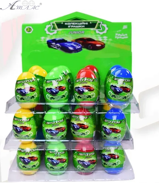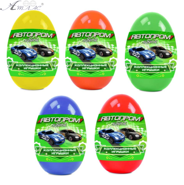 Іграшка сюрприз у яйці. Усередині можна знайти колекційну машину серії "Автопром". Іграшка виконана з міцних та якісних матеріалів. Розмір іграшки: приблизно 9х5 см. Фактичний відтінок виробу може відрізнятися від представленого на фотографії через особливості кольору екрану.