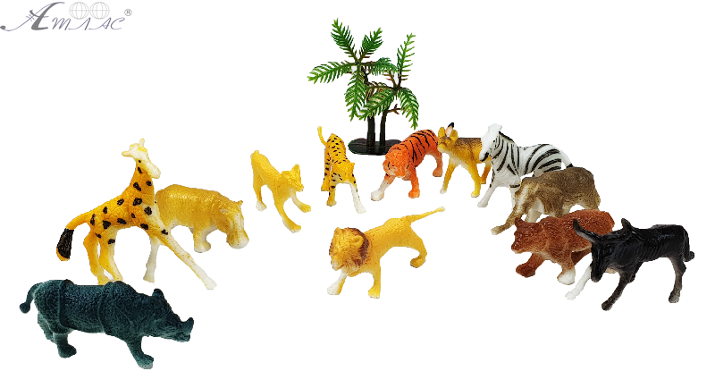 Набір африканських тварин 12 штук з пальмою в тубі. Розмір звіра приблизно 4 – 5см. Фактичний відтінок товару може відрізнятись від зображеного на фото.
