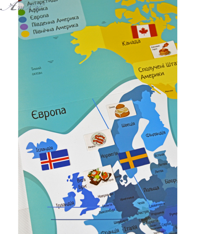 Карта світу у вигляді постера з багаторазовими наклейками (прапори та національні страви). Вивчайте з дітьми прапори з різних країн. Склад: ігрове поле 41х60см, багаторазові наклейки – 100шт. Розмір коробки: 30,5х4х21см. Для дітей віком від 5 років. Фактичний відтінок товару може відрізнятись від зображеного на фото.