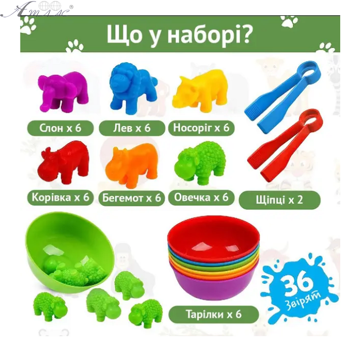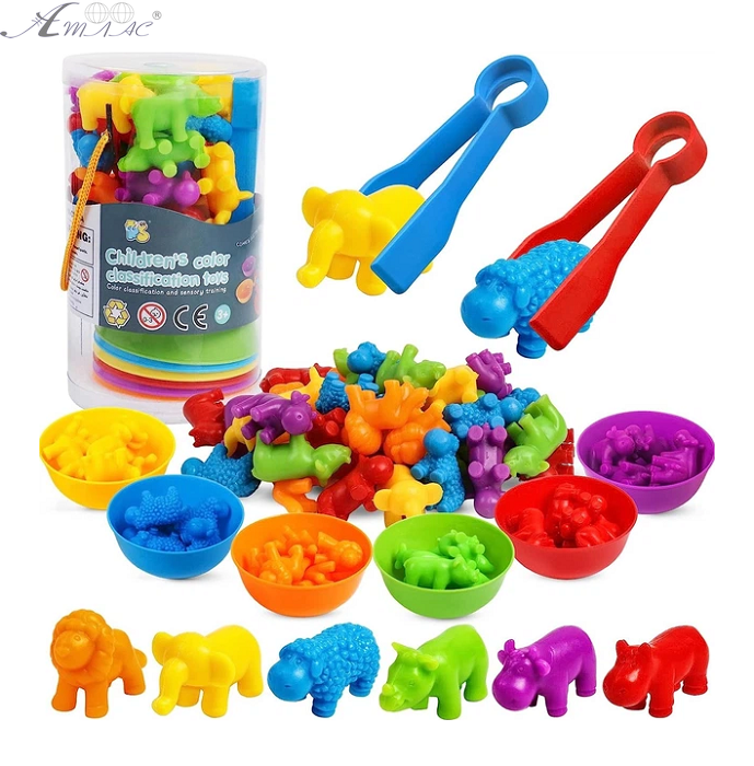 Відмінна гра Монтессорі для вивчення кольору та рахунку – Сортер з 2 пінцетами, 6 тарілочок та 36 різнокольорових та барвистих фігур тварин. Необхідно в кожну тарілочку певного кольору розкласти фігурки потрібного кольору. Фактичний відтінок товару може відрізнятись від зображеного на фото.