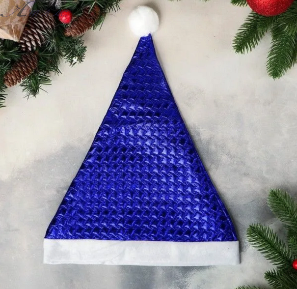 Шапка Діда Мороза синя з білою окантовкою. Матеріал виробу м'який та приємний на дотик. Об'єм 56см. Висота 35см. Фактичний відтінок товару може відрізнятись від зображеного на фото.