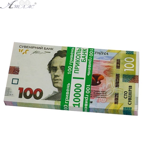Пачка іграшкових, паперових грошей номіналом 100 гривень. Двосторонні. Розміри купюри - 143 х 72 мм. Використовується для ігор та навчання. У пачці приблизно 80 купюр. Фактичний вигляд товару може відрізнятися від зображеного на фото.